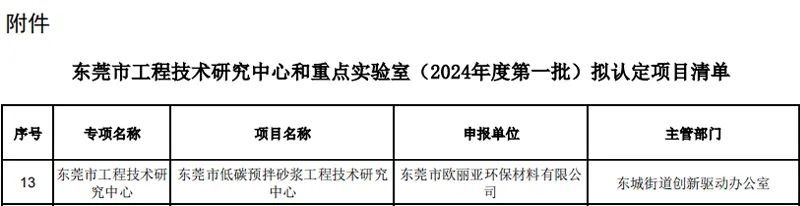 2024年訊——東莞市科學技術(shù)局發(fā)布了《東莞市工程技術(shù)研究中心和重點實驗室(2024年度第一批)擬認定項目的公示》(項目已過公示期),歐麗亞榮獲“東莞市工程技術(shù)研究中心認定企業(yè)”稱號。