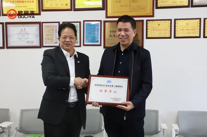 深圳市防水行業(yè)協(xié)會(huì)會(huì)長(zhǎng)瞿培華教授為歐麗亞公司頒發(fā)協(xié)會(huì)理事單位牌匾。