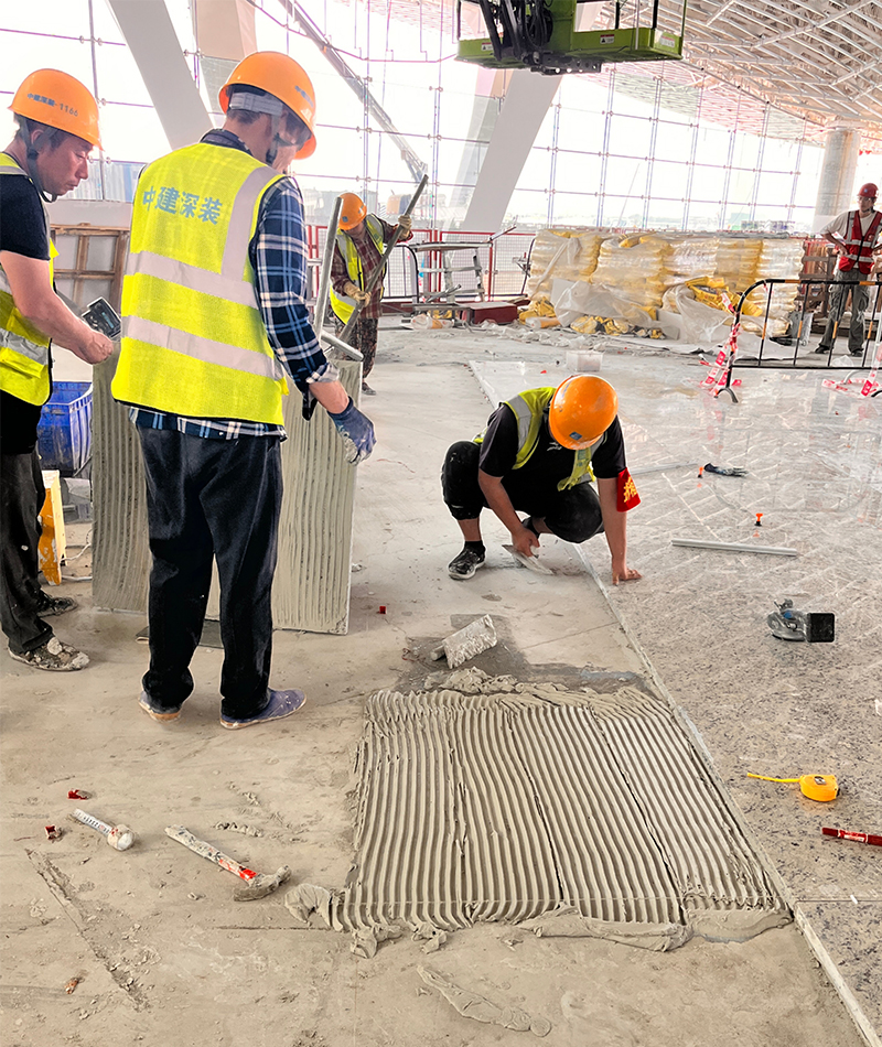 瓷磚膠泥確保墻面、地面瓷磚鋪貼牢固耐用,經(jīng)得起高人流長期考驗;石材膠泥助力木棉花形值機島、嶺南騎樓商鋪等特色區(qū)域的石材裝飾精準呈現(xiàn),還原設計美學;膩子則為航站樓暖色調(diào)墻面奠定細膩基底,讓 “白云舒卷” 的人文溫度與 “花城鮮活” 的地域特色融入每一處空間。從材料品牌報審、進場報驗的嚴格合規(guī),到施工過程中的實時配合,我們與中建深裝及各參建單位緊密協(xié)作,共同攻克工程體量大、專業(yè)交叉多、工期緊湊等挑戰(zhàn),全力保障消防驗收、竣工驗收、行業(yè)驗收等關(guān)鍵節(jié)點順利推進。